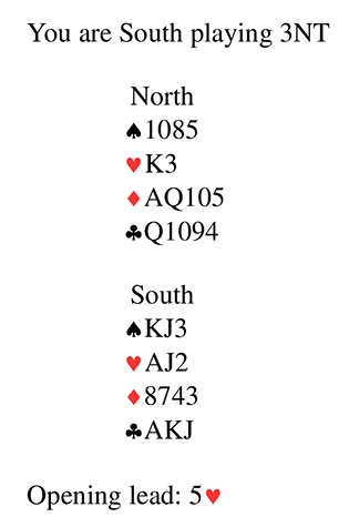 Bridge Quiz 1834 December 7, 2025 by gtyoshida West leads the five of hearts, north and east play low and declarer plays his jack Which card would you play?King of SpadesTwo of HeartsThree of DiamondsAce of ClubsVoteKing of Spades - set up your 9th trick by knocking out the ace & queen while you still have heart stoppers