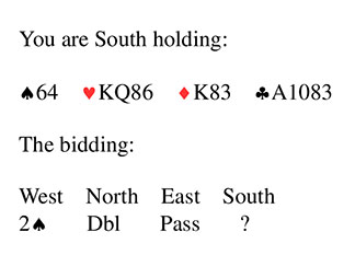 Bridge Quiz 1907 February 18, 2026 by gtyoshida What would you bid?Two No TrumpThree ClubsThree HeartsThree SpadesVoteResultsThree Spades - doubling a 2 level bid shows enough points for game & even slam. Bid ops suit to let him know