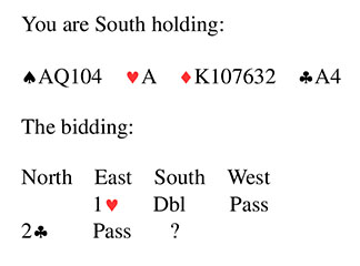Bridge Quiz 1840 What would you bid?PassTwo DiamondsTwo SpadesThree ClubsVoteTwo Diamonds - you hoped partner would bid 1 spade. Bidding a suit after a double promises extra strength