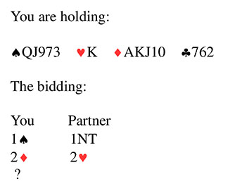 Bridge Quiz 1846 What would you bid?PassTwo SpadesTwo No TrumpThree DiamondsVotePass - partner's bid shows 6+ hearts but his NT response limits hand to 10 pts which may only win tricks in hearts