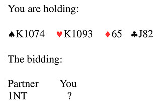 Bridge Quiz 1883 What would you bid?PassTwo ClubsTwo HeartsTwo SpadesVotePass - staymen is tempting but a diamond reply forces 2NT. Finding a major suit fit isn't mandatory for part score