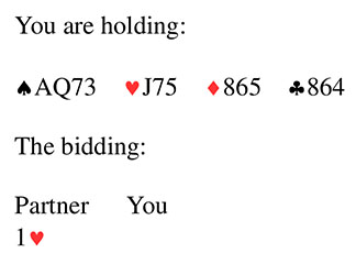 Bridge Quiz 36 What would you bid?PassOne SpadeOne No TrumpTwo HeartsVoteTwo Hearts - shows minimum support with 7 HCP and three Hearts,.