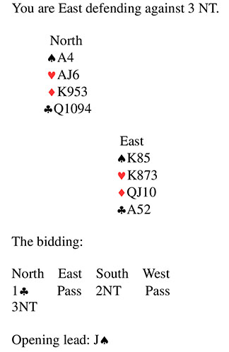 Bridge Quiz 517 West leads the jack of spades and dummy plays low. Which card(s) would you play?Eight of SpadesKing of Spades, Eight of SpadesKing of Spades, Queen of DiamondsKing of Spades, Two of ClubsVoteEight of Spades - partner likely has no side entries so save your king of spades to force the ace then lead your last spade.