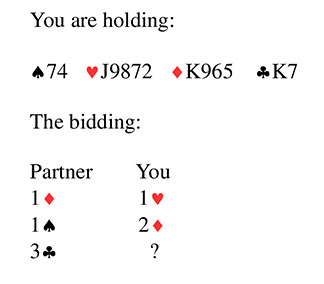 Bridge Quiz 1858 December 31, 2025 by gtyoshida What would you bid?Three DiamondsThree HeartsThree No TrumpFour DiamondsVoteFour Diamonds - your hand is weak but partner still has hand for game. Ruffing your hearts only costs him 1 HCP.